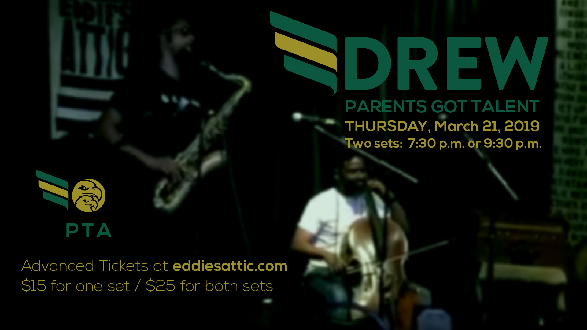 Thank you and happy bidding! - Drew Parents Got Talent – Advanced Tickets at eddiesattic.com: $15 for one set / $25 for both sets Adults only…no kids = ).Eddie’s Attic