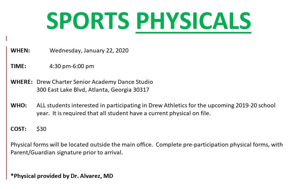 - 4:30- 6:00: Sports Physicals [Cost $30]