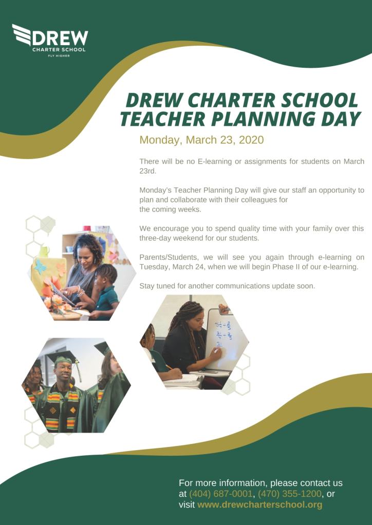 Dear Drew Parents/Guardians: Thank you for hanging in there with us this week as we made our way through the first week of e-learning at Drew Charter School. As we approach the weekend, we wanted to remind you that this coming Monday, March 23rd, will be a Teacher Planning Day at Drew. There will be no new instruction or new student assignments Monday, March 23, 2020. The Teacher Planning Day will give our staff an opportunity to reflect on the successes and challenges of week 1 and plan for the coming weeks. Hopefully, it will also give your family a chance to breathe and regroup as new challenges confront all of us personally in this unprecedented global pandemic. Phase II of e-learning When students return to e-learning Days on next Tuesday, March 24th, we will move into Phase II of e-learning. We have taken this first week, known as Phase I, to adjust to the e-learning platform, find our rhythm, provide assignments, distribute as many devices to families in need as possible, and call our families with students who have yet to show up in their Google Classrooms. Under current circumstances, we feel as prepared as possible to transition to Phase II. We will take a moment to update you on what to expect in Phase II. We encourage you to take the time to talk with your student about what lies ahead in e-learning and the value of engaging in the e-learning process. During Phase II, we will officially transition to incorporating a combination of live, recorded, and vetted instructional videos to deliver mini-lessons, now inclusive of new content. Live instruction will be recorded and posted for future viewing in order to allow families the viewing flexibility we all need right now. Our teachers are positioned, prepared and committed to providing instruction that will best equip our students to access their current 4th quarter curriculum and ensure they are prepared for the next grade level. To ensure that our students are ready, it will require us to teach new content, specifically 4th quarter standards, in an engaging e-learning environment. We appreciate your patience and understanding with our school and especially with our teachers as you communicate with them about your student and about the new processes and practices that are being established. We realize that this level of e-learning is new for everyone involved –the students, teachers, parents and school administrators. I assure you that our commitment and dedication to providing an excellent education to all of our students is unwavering. Know that our staff is working incredibly hard to engage all students in the learning process. We appreciate your patience, support, understanding, and kindness as we transition to Phase II of e-learning. Coronavirus Webpage and Updates We continue to remain aware that the change in your student’s school environment is only one of the new circumstances you are handling daily. As we navigate our world while the Coronavirus outbreak unfolds, Drew hopes to help address some of the other daily living challenges that some of our families face. To ensure families can quickly access updates and available resources, we are continuing to collect and consolidate information on a new Coronavirus Closing and Updates page on Drew’s website. Click here or visit our website anytime to access the page. On behalf of the entire Drew Charter School staff, again, thank you for a productive first week of e-learning. Take the next three days to spend quality time with your family. We look forward to seeing your learner in our virtual learning environment on Tuesday, March 24th. Peter McKnight Drew Head of School |