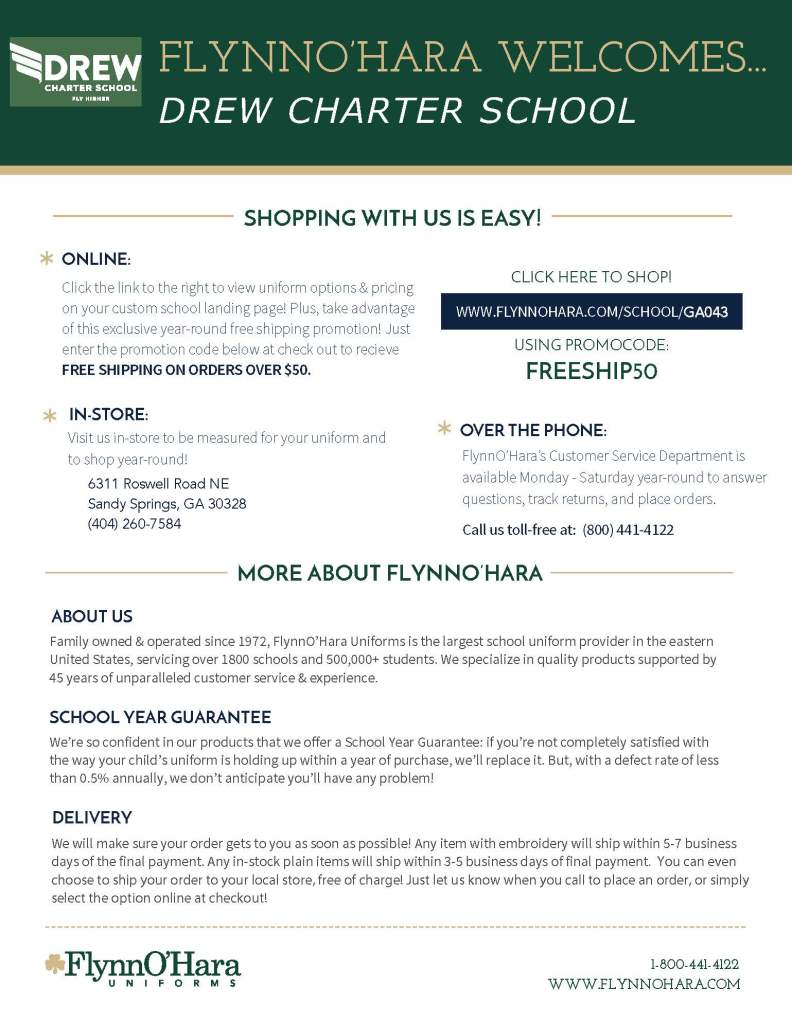 - In the interest of best serving our community, Drew has moved forward with Flynn O’Hara as our new uniform vendor. Thank you to Dr. Allen for all of her work to find a company to best serve our community. Please see the flyer and link below for more information: