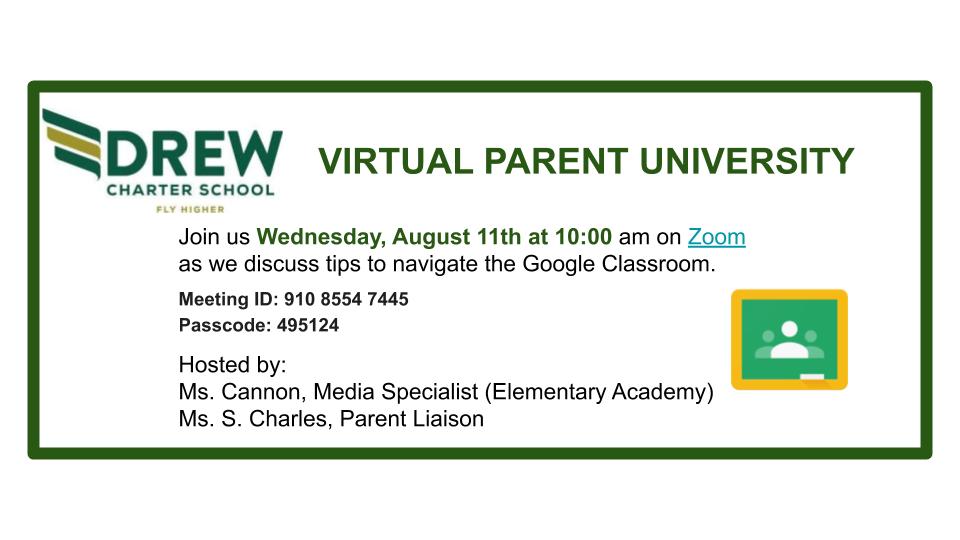 This year Drew will use the virtual instructional model to begin the 2020-21 school year during the first quarter of school. It will also serve as the instructional model should school need to close for extended periods of time once the school reopens for face-to-face instruction. Although we are starting virtually, we will remain connected. Students will have access to ongoing and consistent virtual social-emotional learning activities, instructional sessions, clubs, and meaningful school spirit events. Here is a glimpse at the outline of the student schedule for the start of this school year.