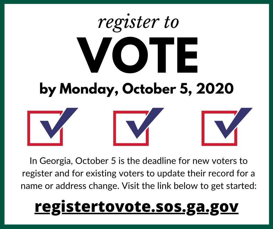 Did you know that in the last major election, millions of Americans didn’t vote because they missed a registration deadline or didn’t know how to register? If you recently moved, turned 18, changed your name, or haven’t voted in recent elections, you have to update your voter registration in order to cast your vote. The deadline to register to vote or update your name or address in Georgia is Monday, October 5, 2020. If you need to register or make a change to your voter registration, please do so before the deadline. Make your vote count! Click Here to Register to Vote in GA