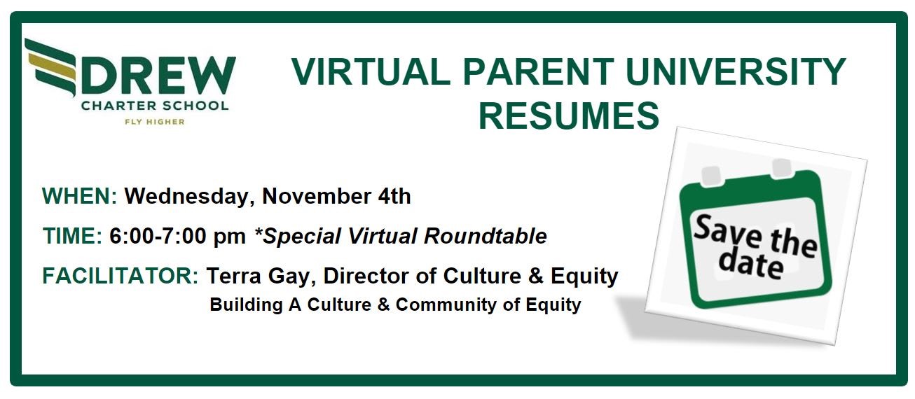 Although I have had the pleasure of meeting many of you, I would like to host a virtual roundtable for all Drew families. During this time I would like to share more about my work to support staff, students and families as we seek to achieve equity and dismantle racism. I wish to also make space for your questions and cultivate space for community discussion. I hope that you will join me on November 4th 6:00-7:00PM EST.