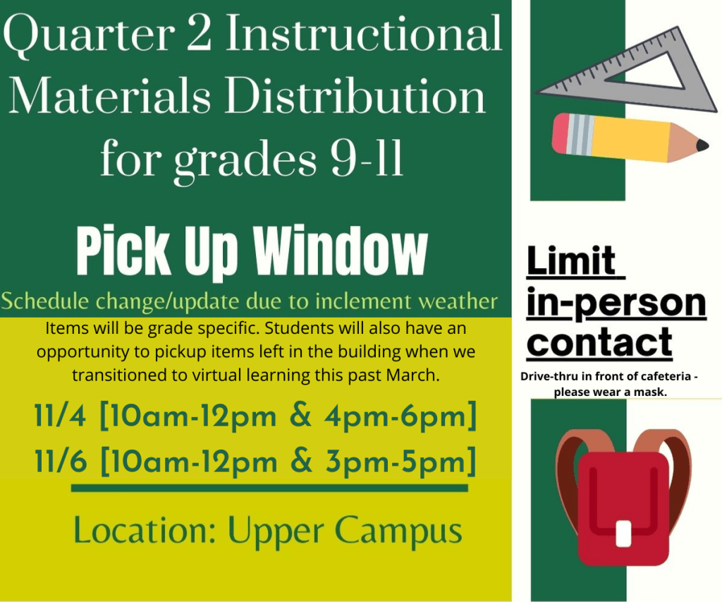In order to further prepare for virtual instruction, we will hold a *contactless drive-through pick-up of 2nd quarter instructional materials starting Wednesday, November 4th. (*updated due to inclement weather forecast)