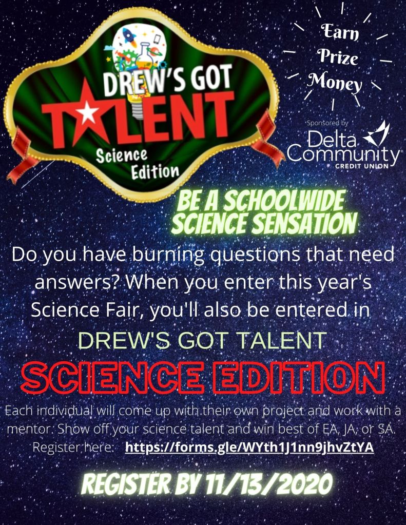 Register for Drew’s Got Talent Science Edition and Science Fair here
