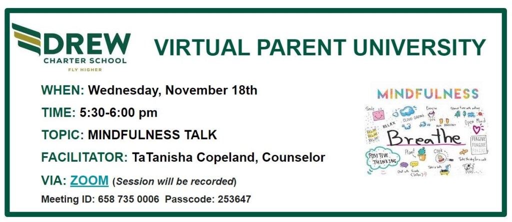As we enter the holiday season, we hope that these targeted support opportunities will proactively assist in addressing many of the critical mental health and wellness needs of our Drew community. We strongly encourage you and your family to participate in offered activities and access available resources. ~ K. Myers