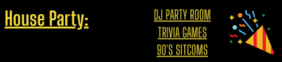 | 1:00-4:00 | DJ PARTY ROOM TRIVIA GAMES 90’S SITCOMS |