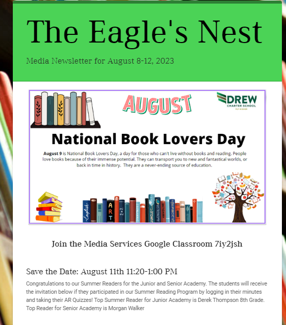 | Counseling Resources, see information below: Dean of CCR: rachel.weaver@drewcharterschool.org 9th and 11th- tara.davis@drewcharterschool.org 10th and 12th: rob.richardson@drewcharterschool.org Click here to learn more about IEP and 504: MTSS/504 Chronicles Vol 1, Issue 5 Media Center Resources, see information below: Google Classroom Code – 7iy2jsh [Students only have access] Maker Space Activities : Checkout the STEAM Initiatives/Opportunities, visit the calendar on their page by following this link –> bit.ly/DrewMAKE |