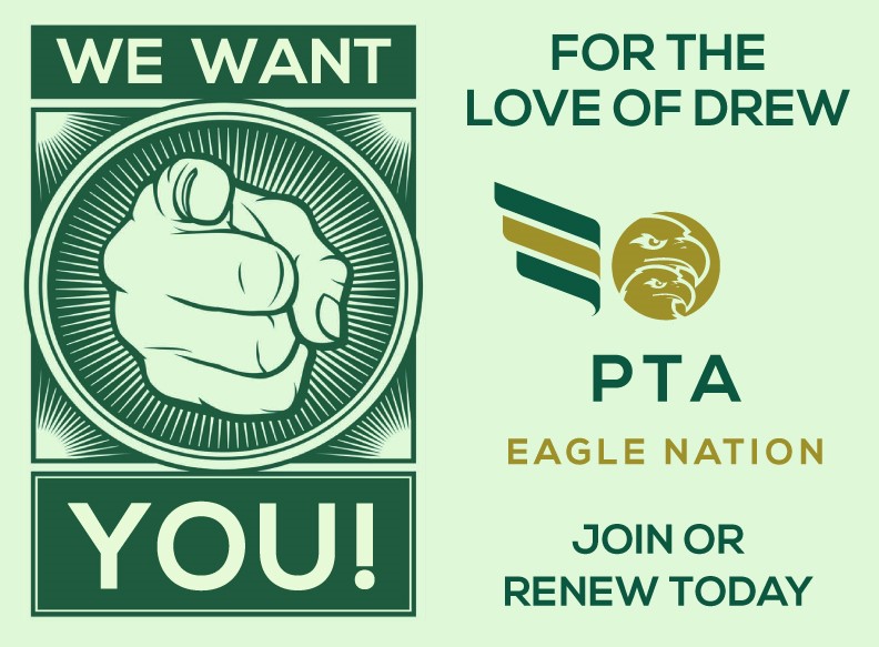 VOLUNTEERS NEEDED The PTA is looking for volunteers to help plan a Drew community event on October 22nd. It would require 1-2 hours of work per week, with most hands on deck the day of event. Please email ptadrew@gmail.com.