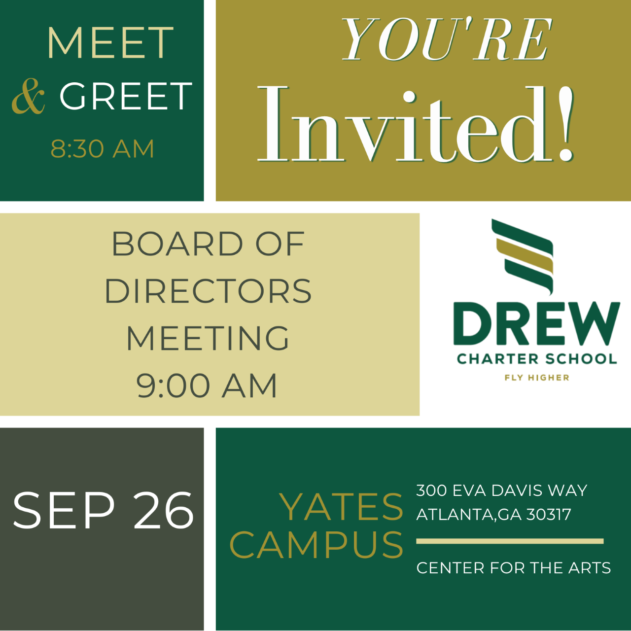 The Drew Board of Directors invites you to join them at a Meet and Greet on Monday, September 26, at 8:30 am, in the Drew Center for the Arts (Yates Campus). Board Chair Shannon Longino and members of the Board are pleased to provide a chance for Drew’s parents and guardians to meet and visit with those representing the school, especially with the new board officers and board members. This is an opportunity to put names with faces and see the work that supports our students and families of Drew Charter School.