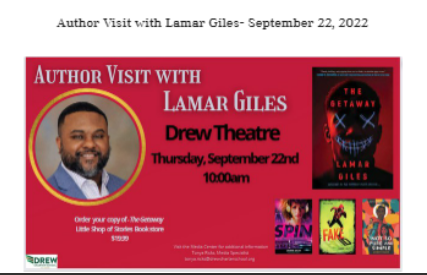 Young Adult author Lamar Giles is coming to share his latest novel, “The Getaway”. Students that wish to purchase a copy of the book may complete the order form and return it to the Media Center before September 21st. NO CHECKS