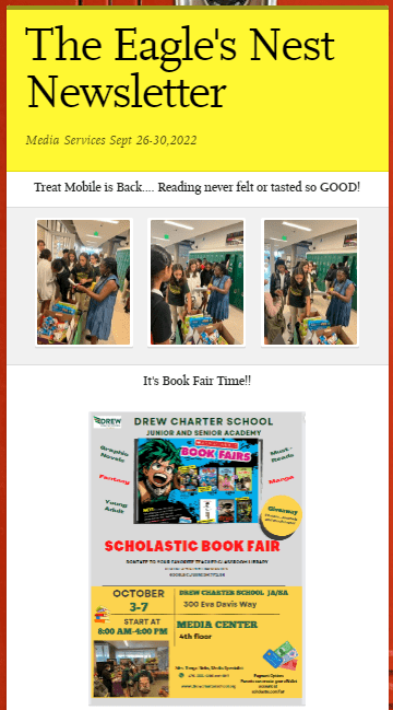 VOLUNTEERS NEEDED The PTA is looking for volunteers to help plan a Drew community event on October 22nd. It would require 1-2 hours of work per week, with most hands on deck the day of event. Please email ptadrew@gmail.com.