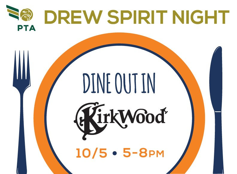 Dine Out in Kirkwood Spirit Night Wed, October 5th, 5-8 pm When you eat at our local restaurants on 10/5, a percentage of sales goes to the Drew PTA. Participating restaurants: Anna’s BBQ, Kirkyard, Elmyriachi & Urban Pie. link: https://www.drewcharterschoolpta.com/dineout