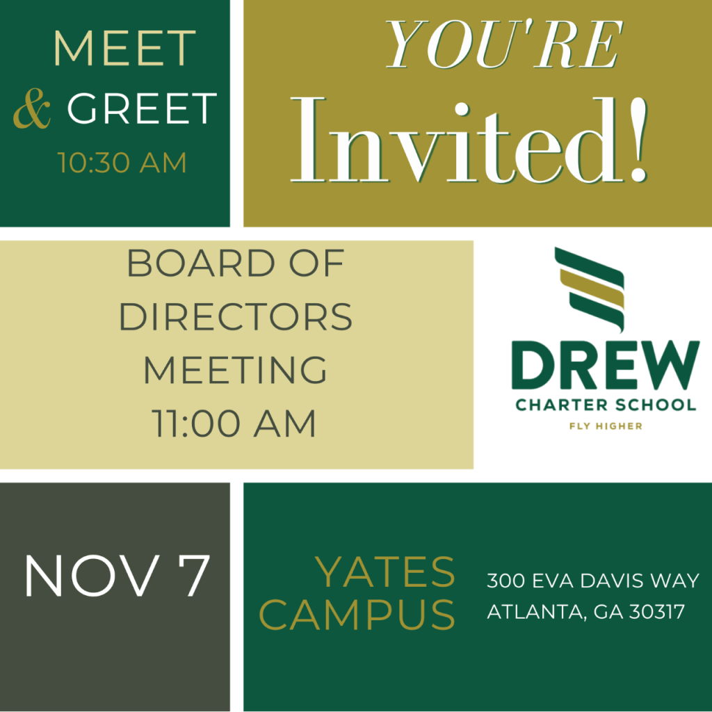 Our Board of Directors invites you to join them for a Meet and Greet on Monday, November 7, at 10:30 am, in the JA/SA Cafeteria (Yates Campus). Board Chair Shannon Longino and members of the Board are pleased to provide a chance for Drew’s parents and guardians to meet and visit with those representing the school. This is an opportunity to put names with faces and see the work that supports our students and families at Drew Charter School.