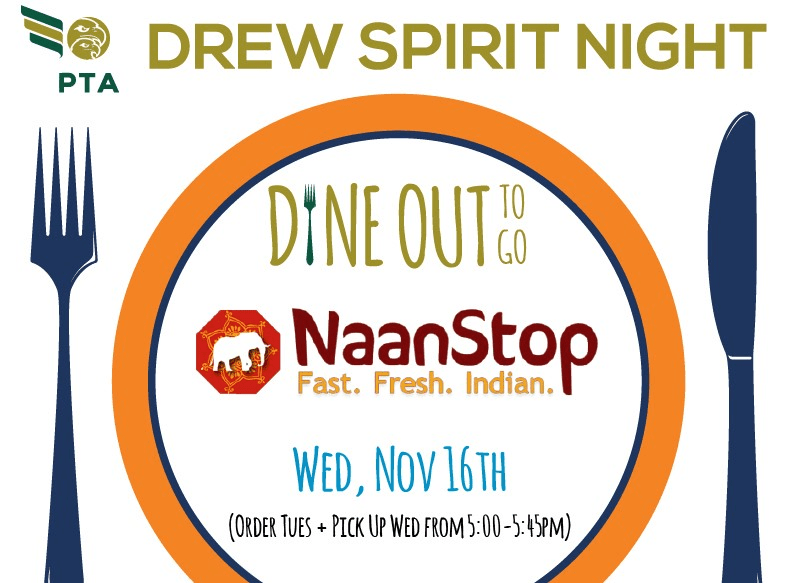 Order a delicious Indian, family-style meal, and 10% of the proceeds will be donated to Drew Charter School PTA! Place your order by 5 pm on Tuesday, 11/15, using this link: