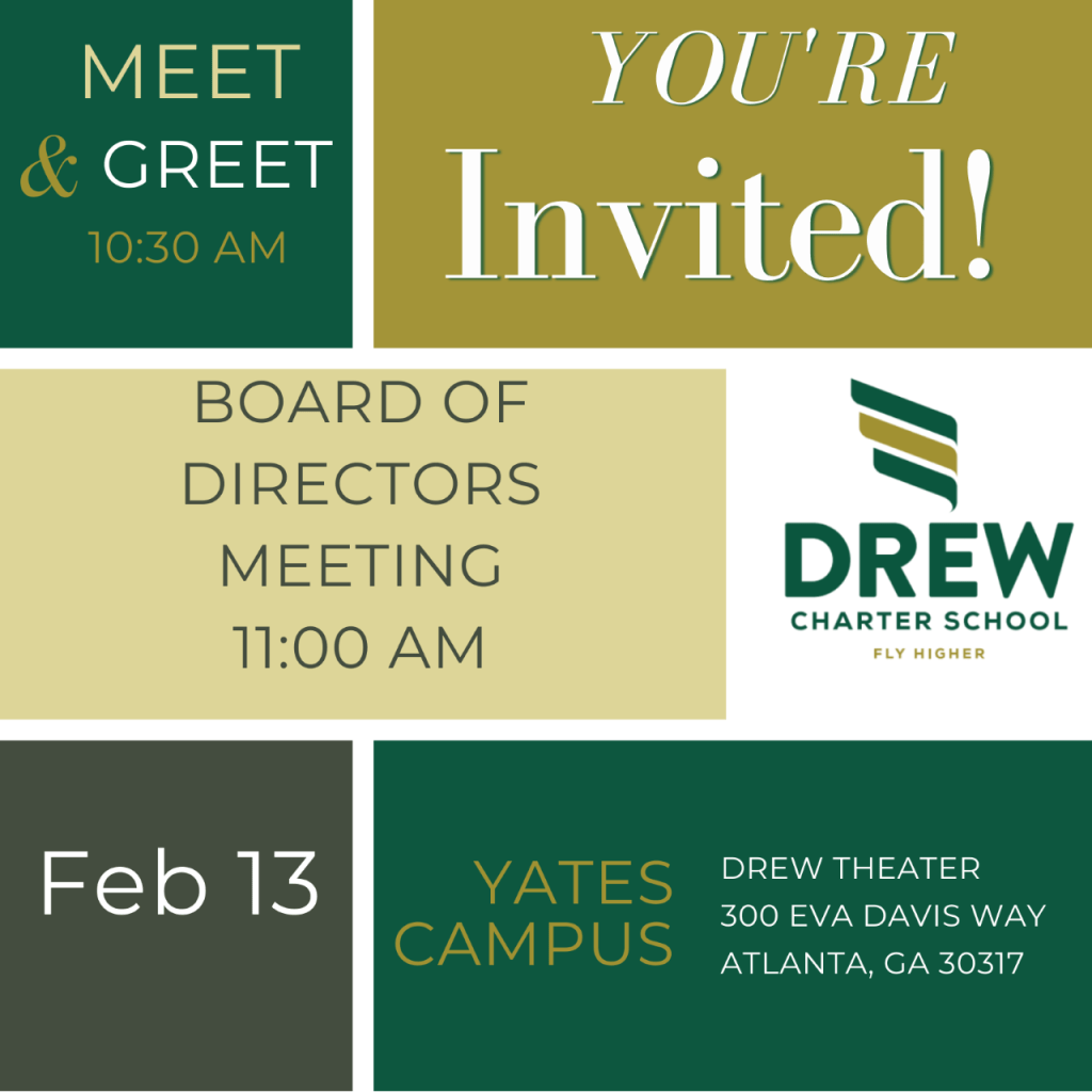 Our Board of Directors invites you to join them for a Meet and Greet on Monday, February 13, at 10:30 am, in the Drew Center for the Arts (Theater). Board Chair Shannon Longino and members of the Board are pleased to provide a chance for Drew’s parents and guardians to meet and visit with those representing the school.