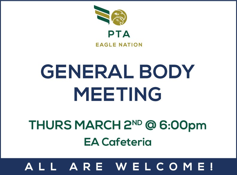 Please join us for a PTA General Body meeting this Thursday at 6 pm in the EA cafeteria. We’ll discuss the PTA programs’ progress for the 2022-23 school year.