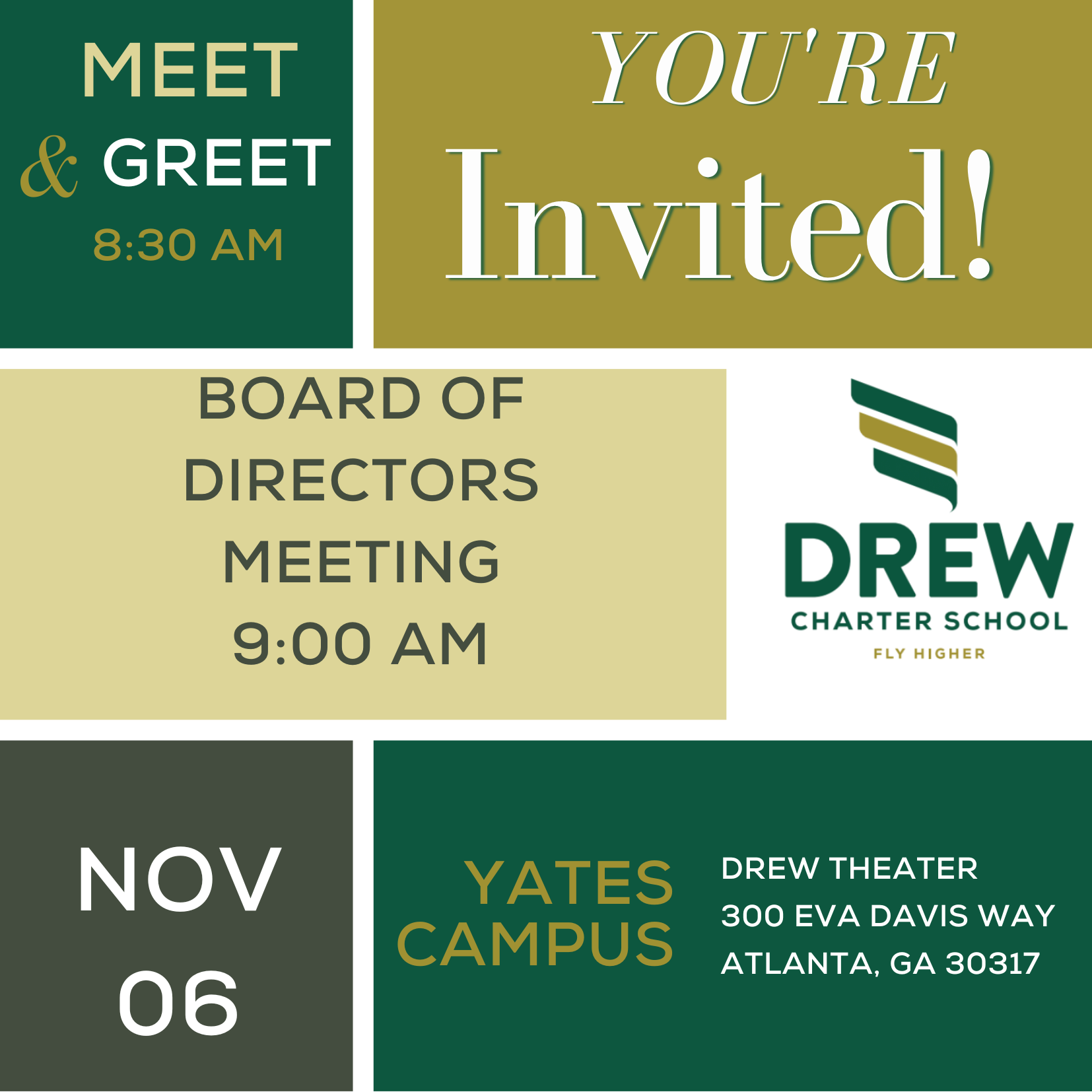 Our Board of Directors invites you to join them for a Meet and Greet on Monday, November 6, at 8:30 a.m., in the Drew Center for the Arts (Theater). The members of the Board are pleased to provide a chance for Drew’s parents and guardians to meet and get to know those representing the school!