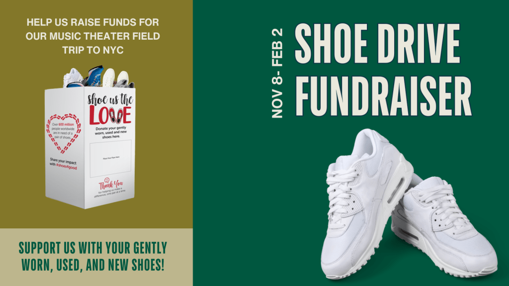 The Charles R. Drew Charter School Fine Arts Department is conducting a shoe drive fundraiser from November 13th to February 2nd, to raise funds for a field trip to New York City. Drew Fine Arts will earn funds based on the total weight of the pairs of gently worn, used and new shoes collected, as Funds2Orgs will issue a check for the collected shoes. Those dollars will benefit our trip. Anyone can help by donating gently worn, used and new shoes at the front entrance at the lower and upper campus.