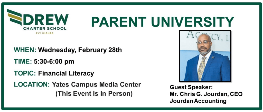 Please join us in the return of our Parent University on Wednesday, February 28th, 5:30-6:00 pm. The guest speaker, Mr. Chris G. Jourdan, CEO of Jourdan Accounting, will lead a discussion on Financial Literacy. Parent University provides information and resources on various topics of interest for Drew Families. We look forward to seeing you in attendance. This is an in-person event.