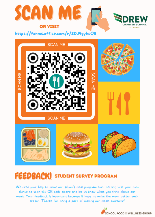 Calling all students! Share your thoughts on our school nutrition program! Your voice matters. Participate in our school nutrition survey and help us make your Drew Dining experiences even better. Your feedback shapes our menu!