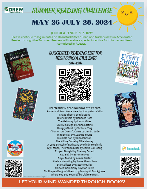 | Counseling Resources, see information below: Dean of CCR: rachel.weaver@drewcharterschool.org 9th and 11th: takiedra.white@drewcharterschool.org 10th and 12th: rob.richardson@drewcharterschool.org Click here to learn more about IEP and 504: MTSS/504 Chronicles Vol 1, Issue 5 Media Center Resources, see information below: Google Classroom Code – 7iy2jsh [Students only have access] Maker Space Activities : Checkout the STEAM Initiatives/Opportunities, visit the calendar on their page by following this link –> bit.ly/DrewMAKE |