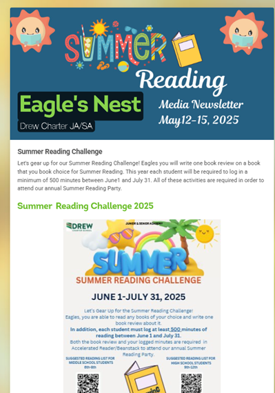 | Counseling Resources, see information below: Dean of CCR: rachel.weaver@drewcharterschool.org 9th and 11th: takiedra.white@drewcharterschool.org 10th and 12th: rob.richardson@drewcharterschool.org Click here to learn more about IEP and 504: MTSS/504 Chronicles Vol 1, Issue 5 Media Center Resources, see information below: Google Classroom Code – 7iy2jsh [Students only have access] Maker Space Activities : Checkout the STEAM Initiatives/Opportunities, visit the calendar on their page by following this link –> bit.ly/DrewMAKE |
