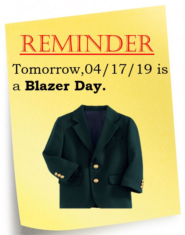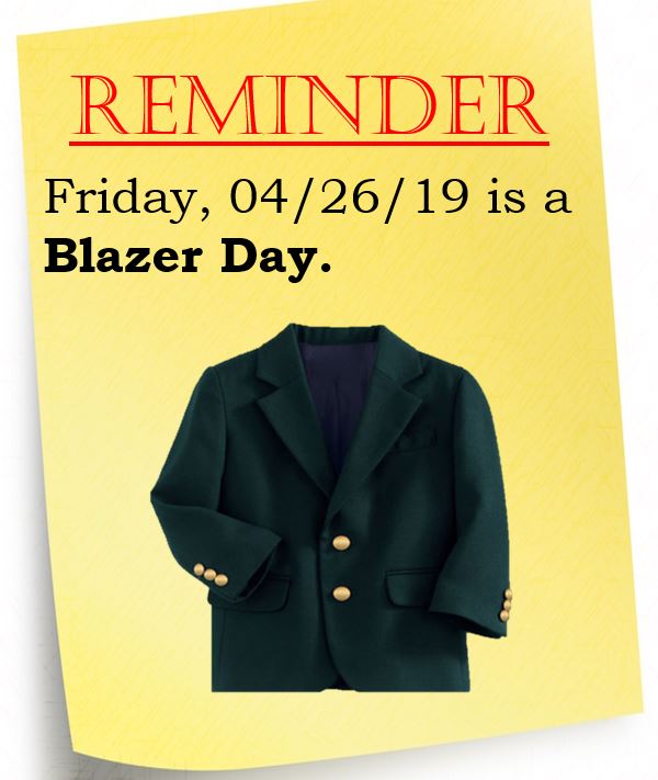 - This Friday, there will be a Half-Day for Parent Conferences and students are expected to wear Blazers on 04/26.